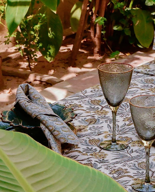 Cypress är en vacker servett i naturlig linne från Chamois. Mönstret är handtryckt med träblock i traditionell indisk blockprintteknik.