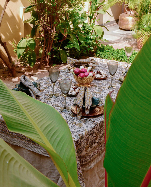 Parrot är en vacker bordsduk i naturlig linne från Chamois. Mönstret är handtryckt med träblock i traditionell indisk blockprintteknik.