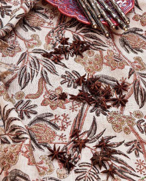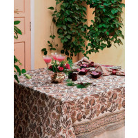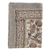 Parrot är en vacker bordsduk i naturlig linne från Chamois. Mönstret är handtryckt med träblock i traditionell indisk blockprintteknik.