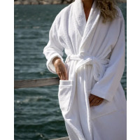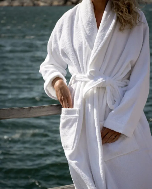 Fontana från Milli Notti är en klassisk badrock i fin, hållbar ekologisk design - Svep in dig i ett moln av fluffig lyx som varar. Designen är klassisk med skärp i midjan och bred sjalkrage, samt med fina detaljer som Mille Notti-loggan broderad på insida nacke och en dekorativ bård på fickorna. Badrocken är tillverkad i ringspunnen frotté av kammat och 100 procent ekologiskt bomullsgarn. Ringspunnen innebär att de ekologiskt odlade bomullssträngarna har vridits och tunnats ur så att de blir extra fina, starka och mjuka. Resultatet blir en frotté som behåller sin fina kvalitet länge. Med kammad bomull menas att man kammat bomullsgarnet för att avlägsna de korta fibrerna, vilket resulterar i en mjukare väv av god kvalitet som inte noppar sig.