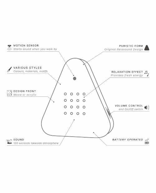 Du aktiverar speldosan när du passerar den och om ingen ny impuls följer tonar den ut efter två minuter. Oavsett om du har den hemma eller på kontoret, i badrummet eller i hallen kan du placera din speldosa "Lakeside" var som helst eller helt enkelt hänga upp den på väggen.